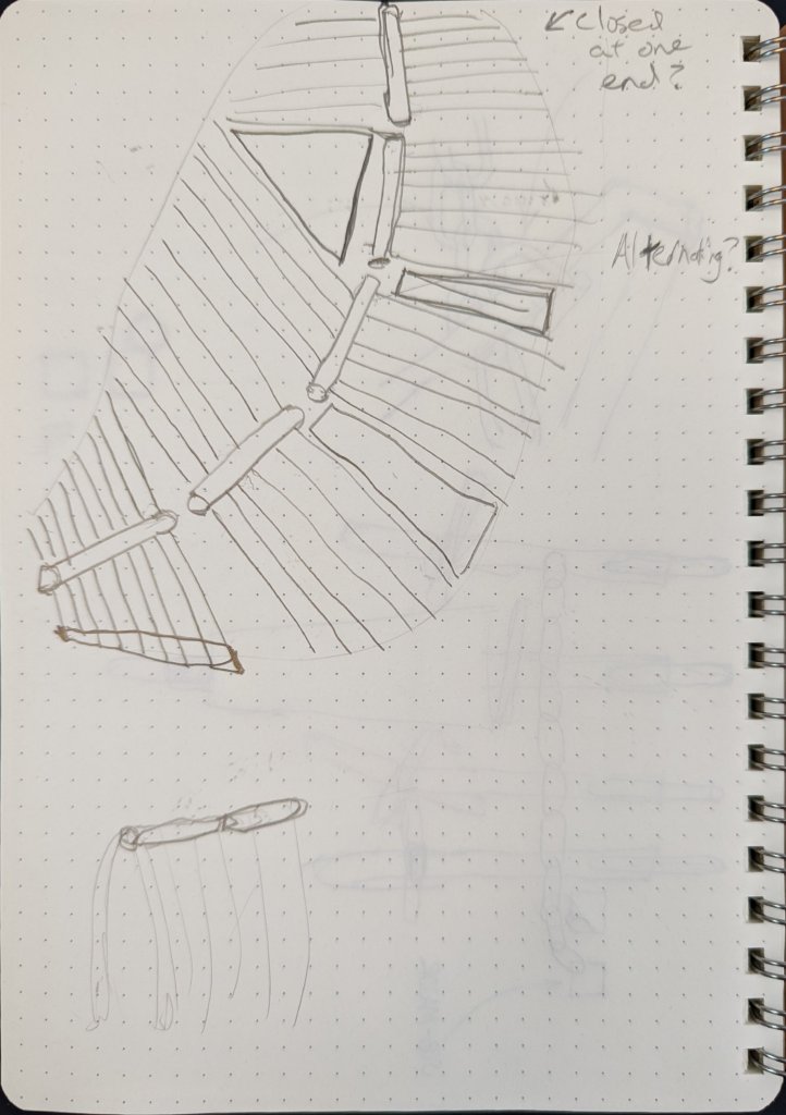 A pergola. It is bleached gray white. Each rib is huge but also slight, as the sun shoots through gaps. Each piece of spine is straight rolled paper tube, but the length of the spine is broken. The ribs are anchored into a wood frame, slotting in the ground. There is a gap between the frame and the anchor. An organic impression, but a systemic approach.