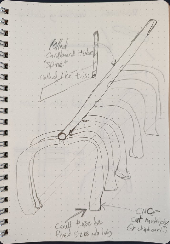 It arrives in a stack of ribs of 3 sizes, all over length to be cut on site. Long paper roll tubes are cut onsite into the spine sections. The ribs fit to a steam-bent sheet collar (not shown) that clamps around the tube, distributing the load of the rib.